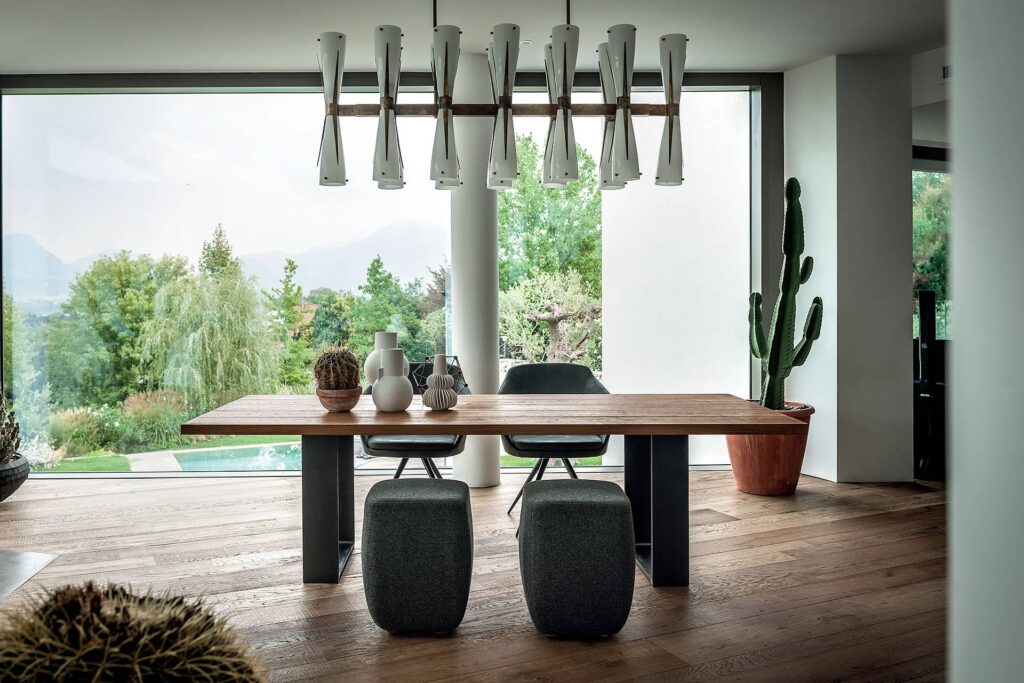 Diseño de C.R. & S. RIVA1920 es una mesa con tapa de madera maciza en listones encolados con una estructura recta elaborado en hierro con juntas soldadas a la vista para mostrar su estructura firme y segura.