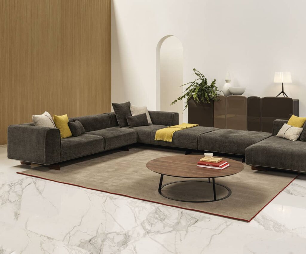 El sofá seccional Coleman diseñado por Ludovica y Roberto Palomba para la marca Horm está elaborado en un marco de aluminio patentado por Horm y resalta el alto nivel artesanal de sastrería Made in Italy. Sus asientos acolchados a diferentes alturas garantizan un máximo confort.