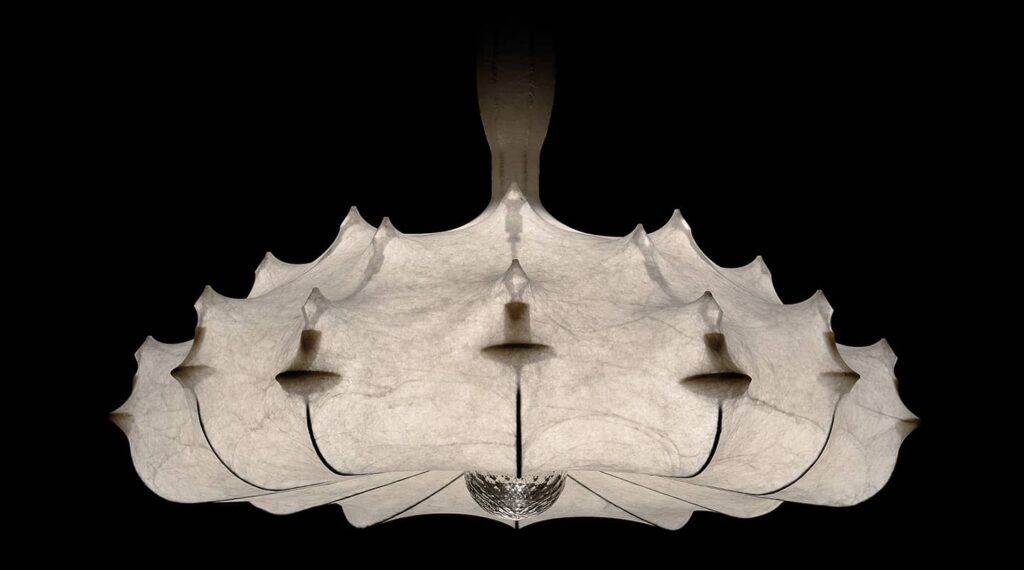 Es una de las piezas más bellas que tiene la marca Flos del diseñador. Esta lámpara cuenta con una cúpula de yeso pintado al interior. Al exterior cuenta con acabados cromáticos que pueden ser en óxido, negro brillante, blanco brillante y oro opaco.