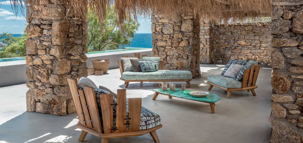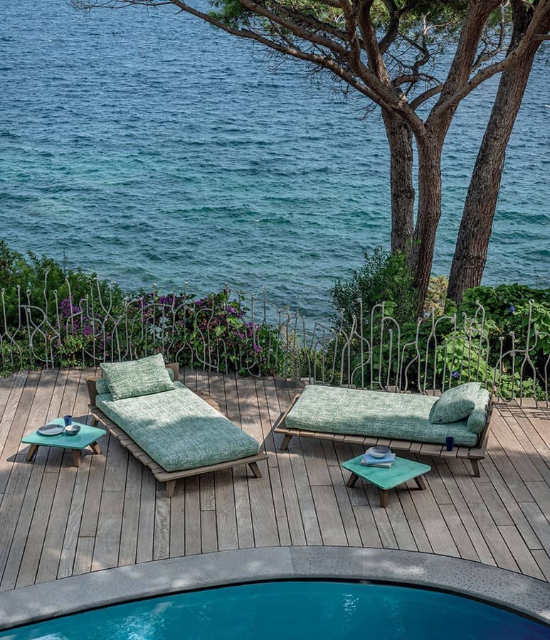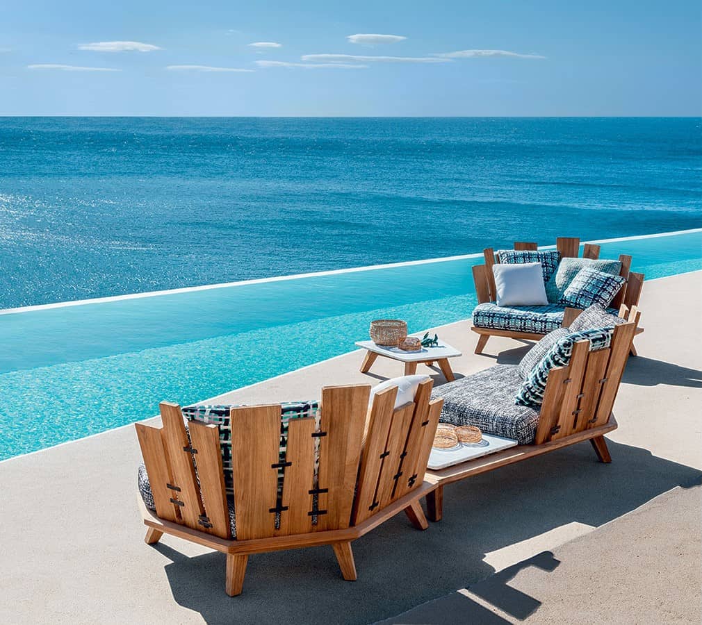 Hermoso conjunto elaborado para la marca Ethimo. Este diseño es ideal para terrazas, jardines o albercas. Su estilo rústico y moderno, crea un ambiente único y diferente. Los materiales de los que se encuentra elaborado principalmente es de madera de Teca. Permitiendo su uso en exteriores.