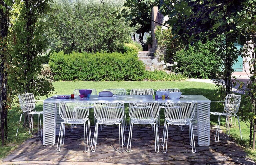 Concepto de estilo industrial para uso al aire libre creado para la marca Emu. Su diseño es lineal y severo con asientos que se complementan con mesas en diversas dimensiones. Se encuentra elaborado en una red de acero que crea piezas con un efecto de ligereza.