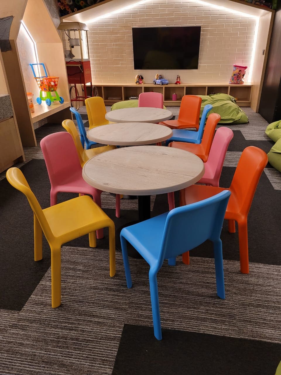 El restaurante B N, ubicado en la ciudad de Puebla, buscaba crear un espacio especialmente para los comensales más pequeños. En Shopdesign Pro trabajamos de la mano con los responsables del restaurante para crear un espacio colorido, divertido, cómodo y con mobiliario infantil. Para el espacio se seleccionaron los puff Straps Kids se la marca Basic Puff para darle un toque relajado. Para las mesas se seleccionaron bases circulares y cubiertas muy duraderas en acabado old pine complementando con las sillas coloridas Bimba de la marca Offiho. Se pensó en mobiliario que además de tener estilo fuera muy resistente. Especialmente para este tipo de espacios, ya que, para un área infantil se requiere mobiliario que dure.