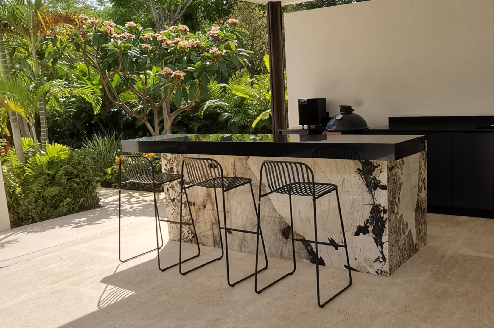 Este proyecto fue trabajado directamente con el dueño de esta hermosa residencia en Mérida. El cliente buscaba una marca de exterior para amueblar su terraza. Por lo que se le propuso la marca Emu para diversas áreas como fue, la alberca, la barra y el comedor. Emu es una marca italiana con más de 60 años de experiencia convirtiéndose en expertos en el mobiliario para el exterior. Esta firma es poseedora de conocimiento en el uso del metal, sus diseñadores trabajan constantemente en la innovación y desarrollando nuevas técnicas de fabricación logrando destacar la funcionalidad, calidad y cuidado en el mobiliario. Buscan que sus diseños puedan transmitir tranquilidad y que las personas puedan disfrutar de sus momentos además de cuidar detalles estéticos, comodidad y practicidad de sus productos. En el área de la alberca se propuso la colección Heaven, compuesta por dos sillones y una mesita baja que le dan una ligereza al lugar. Lo que distingue a esta colección es su estructura elaborada en acero con formas armónicas y sofisticadas transmitiendo elegancia poco convencional. Por otro lado, la barra fue amueblada por la colección Rivera, compuesta por tres bancos altos los cuales están elaborados de acero resistentes al exterior. Las principales características de la colección Rivera son que destaca sus rasgos minimalistas y elegantes, resalta su estructura es totalmente soldada, barnizados con EMU-COAT. Por último, el comedor fue complementado con las sillas de la colección Nef. Esta colección cuenta con un diseño ecléctico combinado con ligereza visual. Las sillas están elaboradas en acero inoxidable, aluminio y cuerda sintética. El trenzado le da un toque sofisticado el cual realza el área con este delicado decorativo en el respaldo brindado comodidad y un estilo relajado.