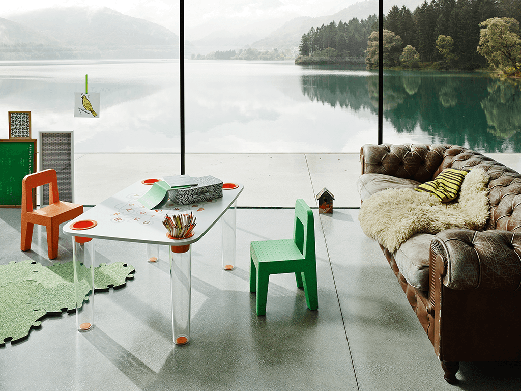 Hermosa mesa elaborada en policarbonato moldeado por inyección estándar con tablero en MDF con portalápices en cada una de sus esquinas para que los niños coloquen sus colores favoritos mientras pintan, realizan su tarea o elaboran manualidades. Este diseño es una creación de Marcel Wanders el cual buscó proyectar diversión en esta pequeña mesita que puede ser colocada en cualquier espacio de tu casa, sin preocuparte por el material del que está elaborado ya que esta pensado especialmente para niños.