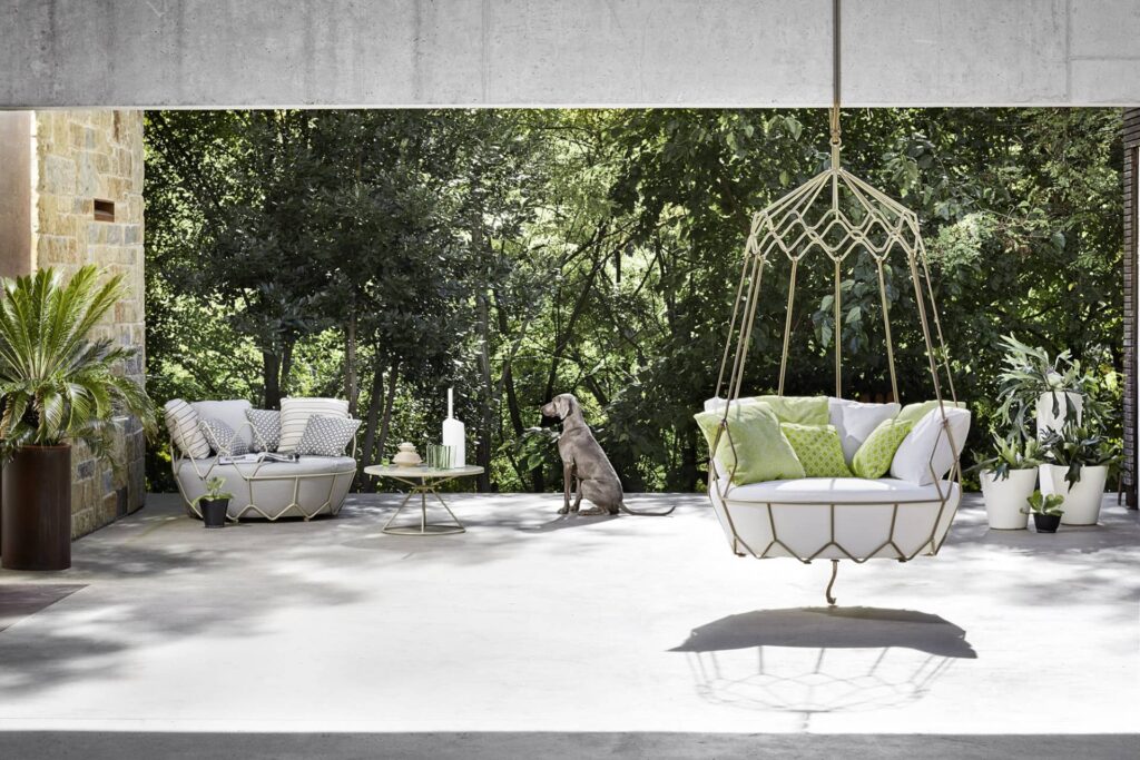 Su diseño y comodidad crean rincones acogedores refinados para diversos espacios. Cuenta con tres diferentes diseños, con cuerdas colgantes, con marco portante y con parasol.